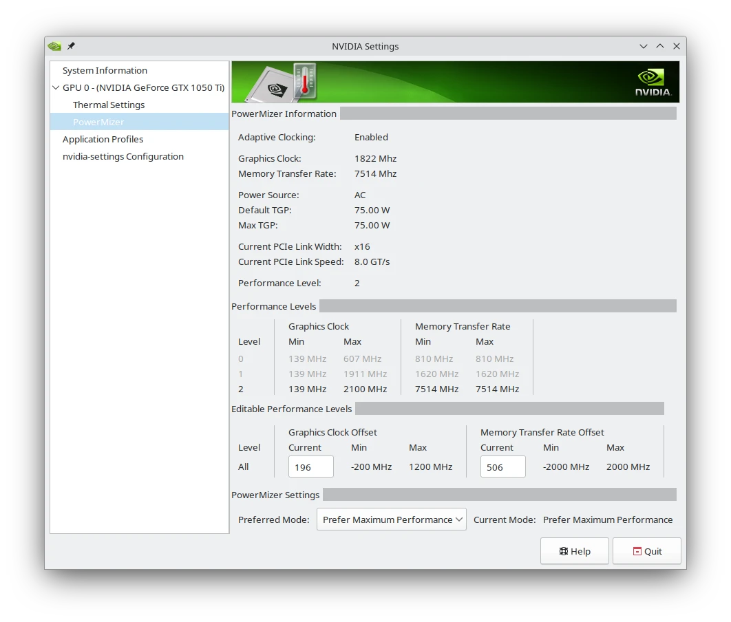 其實Nvidia專有驅動附贈的Nvidia X Server Settings程式本身就有超頻選項了,預設為隱藏,需要透過設定「Coolbits」的參數來開啟。GreenWithEnvy只是多了選擇設定檔的按鈕。