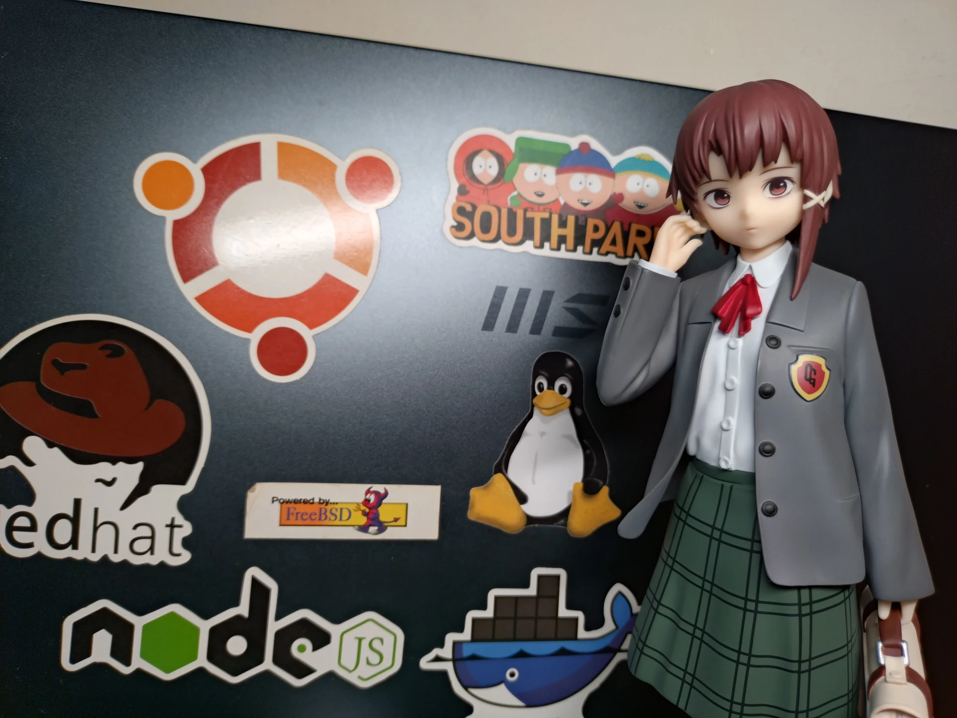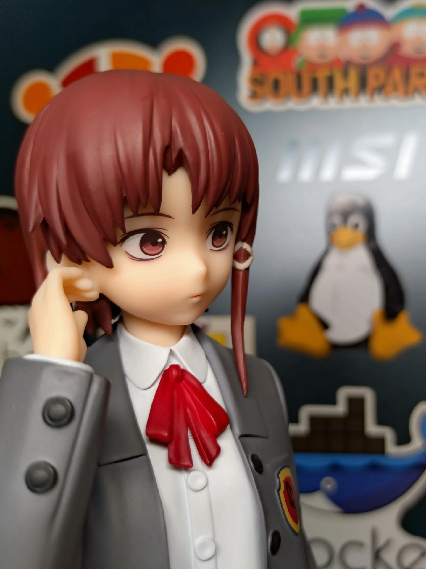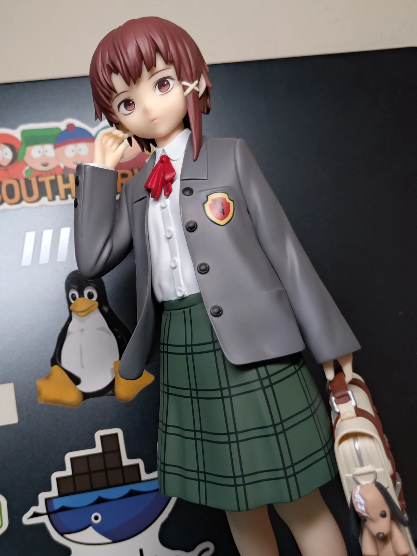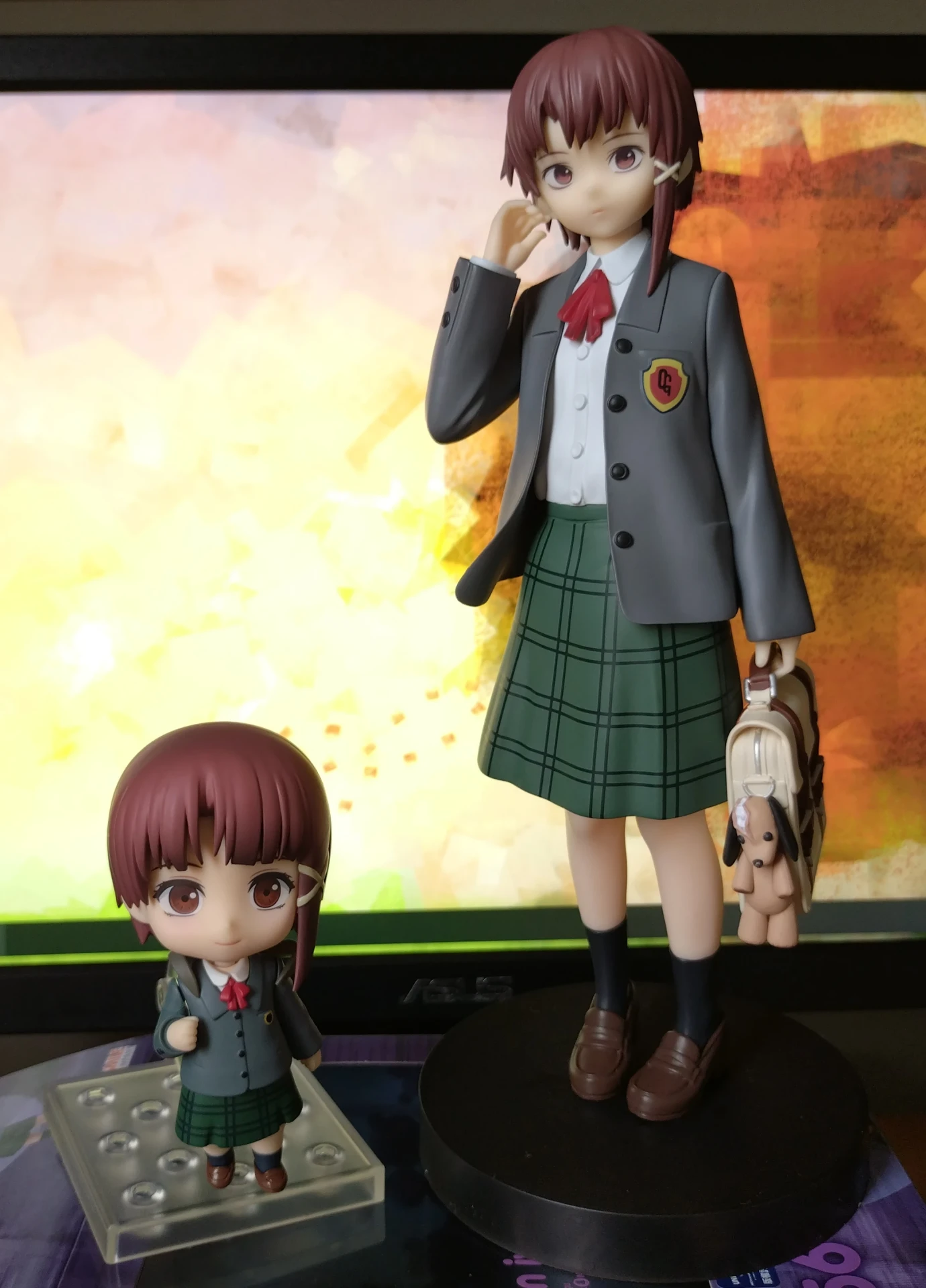 大小隻Lain的身高差。黏土人可玩性比較高,有可愛的笑臉配件能換而且可動。且大隻的Lain沒有附上動畫裡面場景的背板,缺少了那種神秘科技感 ~ 不過我倒是覺得,這隻大隻的Lain能放在我的Linux主機上當守護神吧~