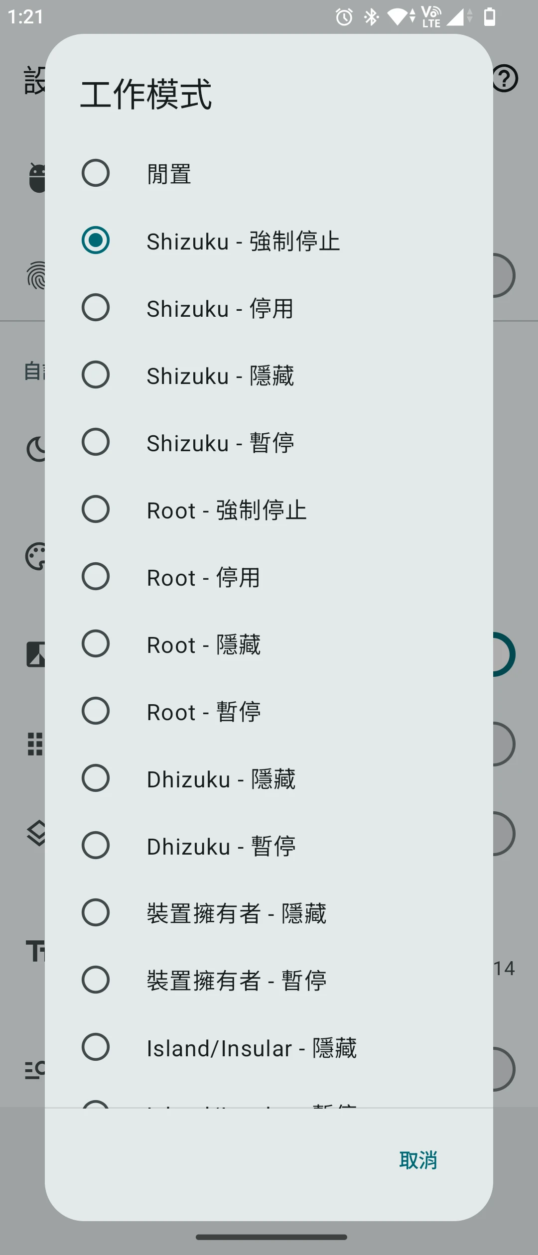 接著在雹APP設定 → 工作模式選「Shizuku - 強制停止」