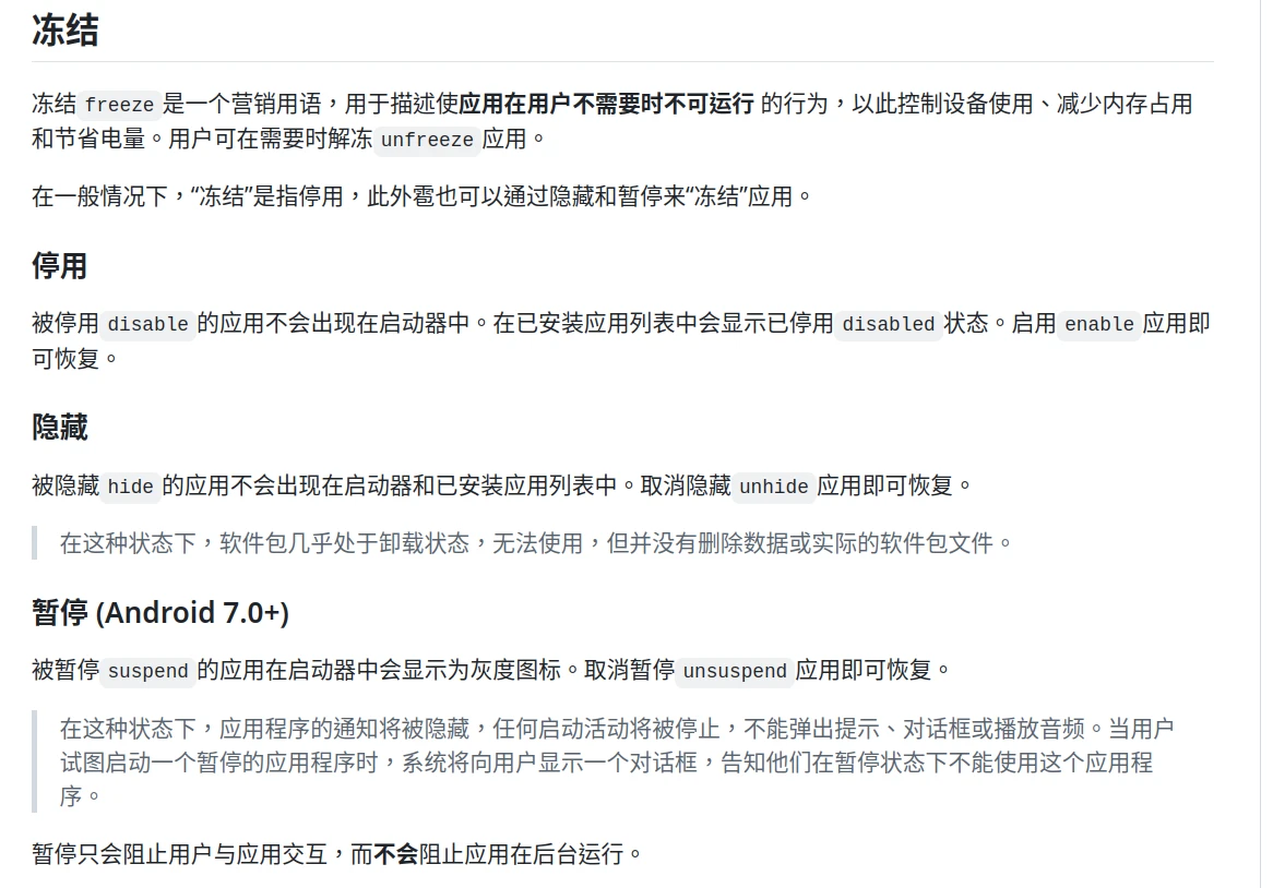 雹對APP的操作,利用Android原生的機制,分為強制停止、停用、隱藏、暫停幾種。以下是作者Github對不同模式的說明: