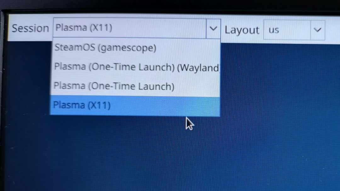 這樣下次就會跑到SDDM,而非自動登入Gamescope session了。點左上角選單,嘗試登入Plasma(X11)工作階段,Plasma就是SteamOS的桌面模式。