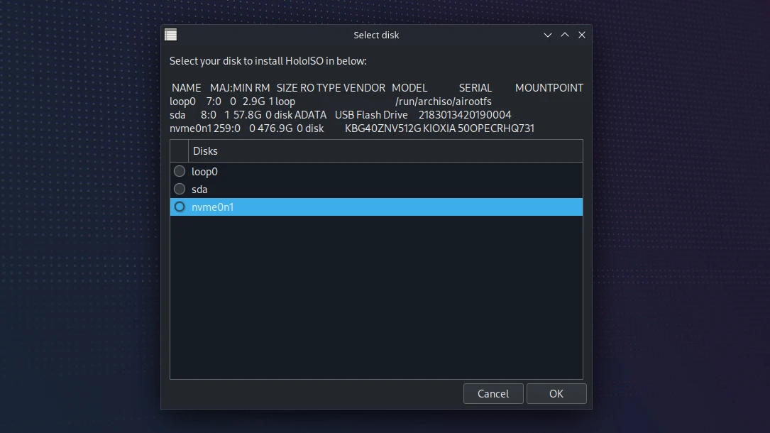 我在QEMU/KVM虛擬機測試過了,HoloISO開機會黑螢幕,一定得裝在實機。