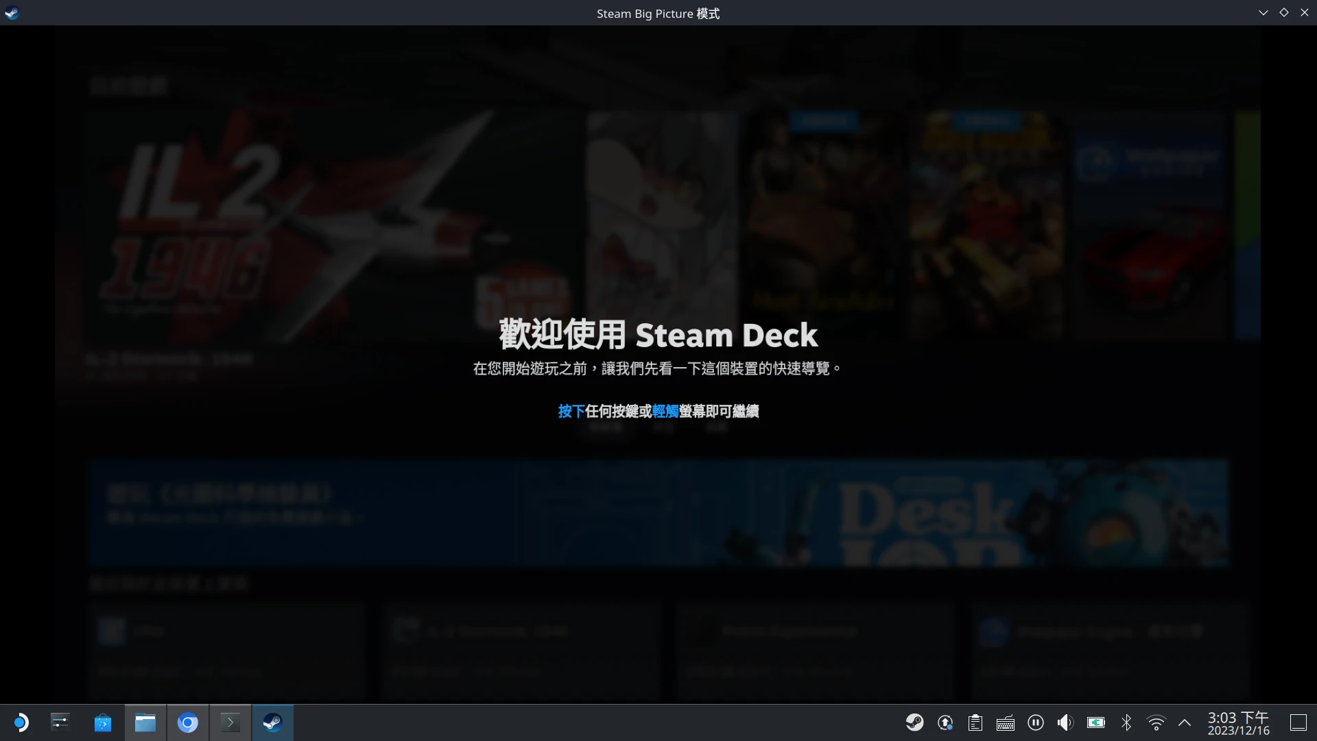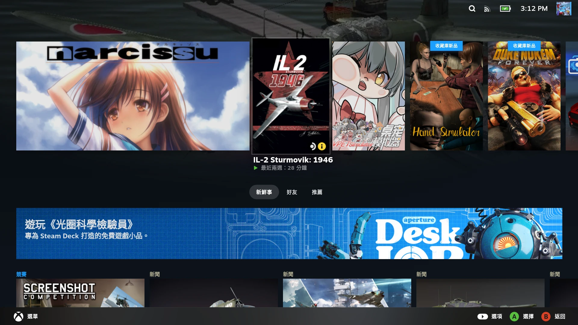 這才叫出了Steam Deck的畫面(新版Big Picture Mode),可以用觸控、鍵盤、搖桿之類的方式操作界面。
