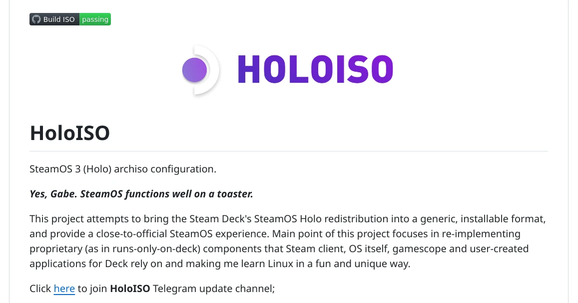 而HoloISO專案的目的就是要讓SteamOS能安裝在任意的x86電腦或掌機,用於填補Valve正式釋出SteamOS之前的空缺。