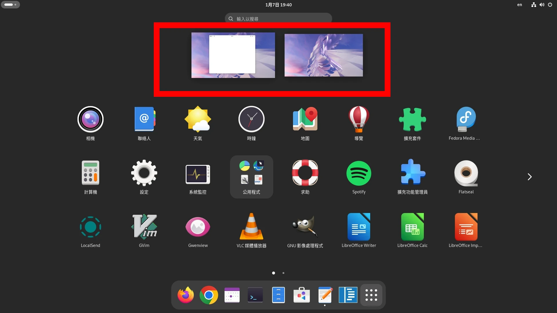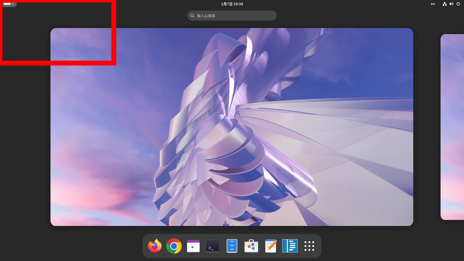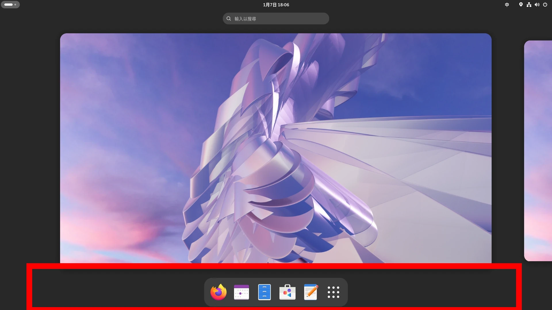 點一下左上角進入概覽界面,你就會看到螢幕下方出現一排應用程式工作列,GNOME把它叫做「Dash」。在Dash的左側會顯示你釘選的程式,右側是開啟的程式。