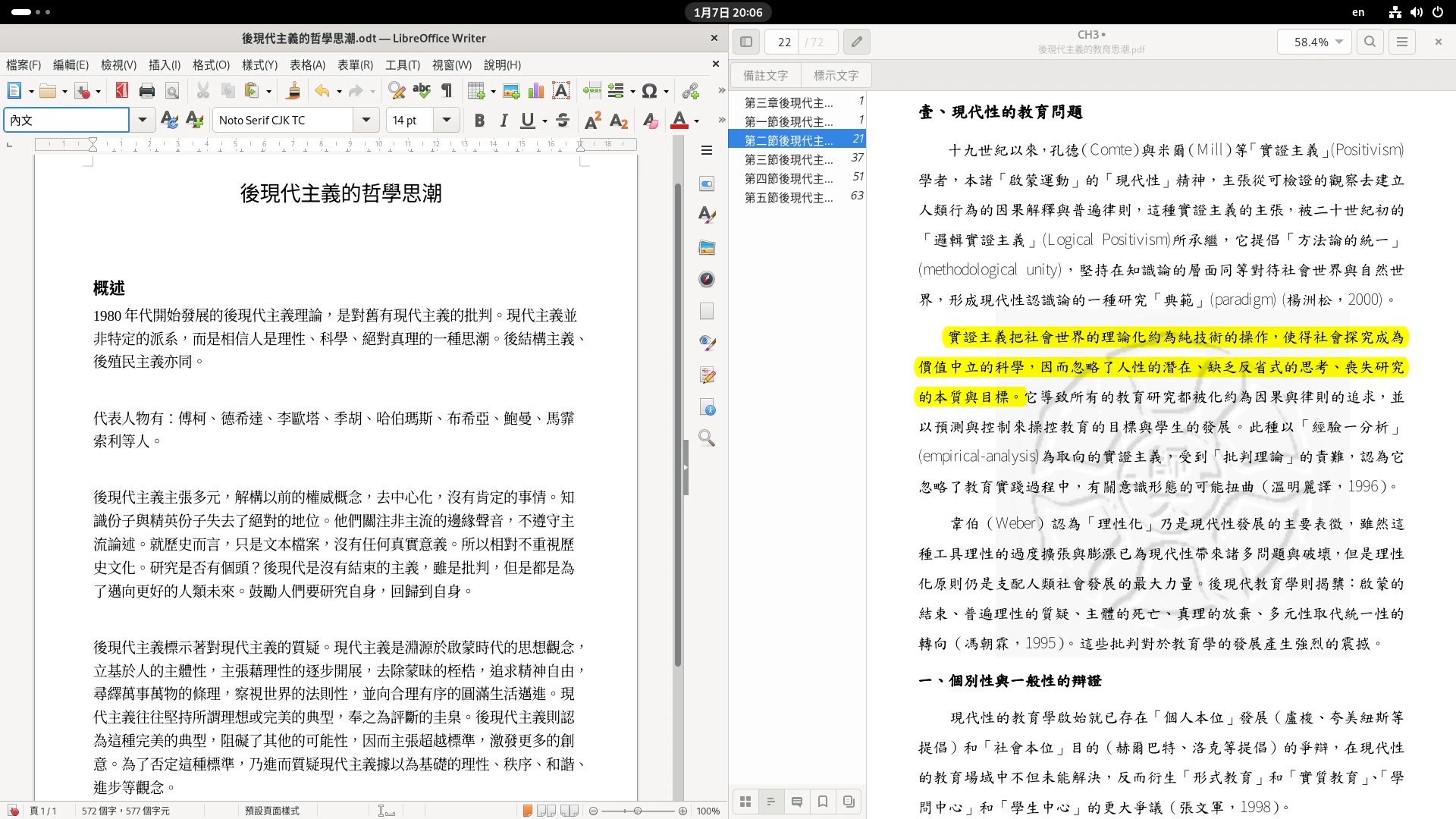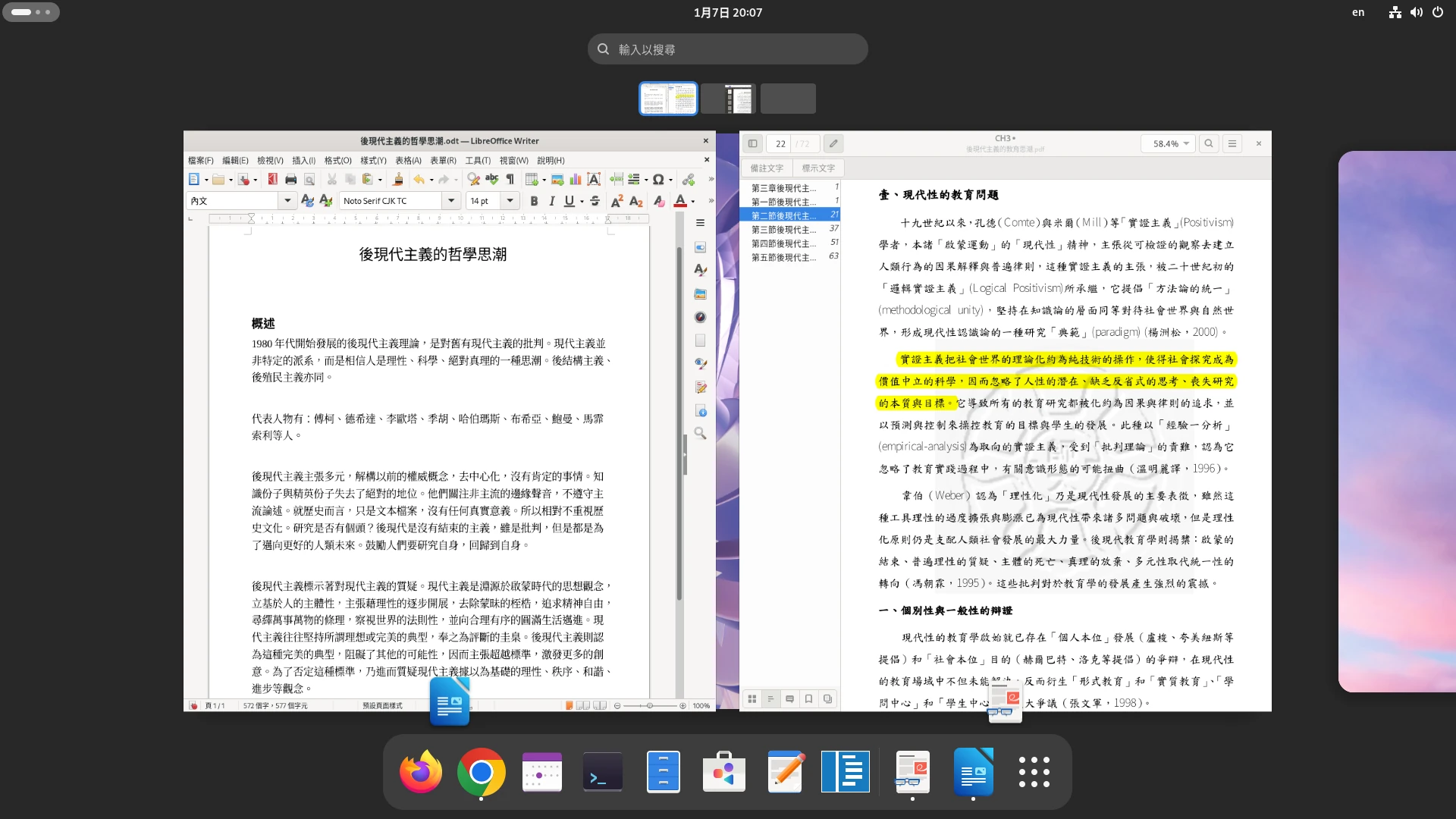 這是第一個工作區的樣子。只有LibreOffice和PDF檢視器。