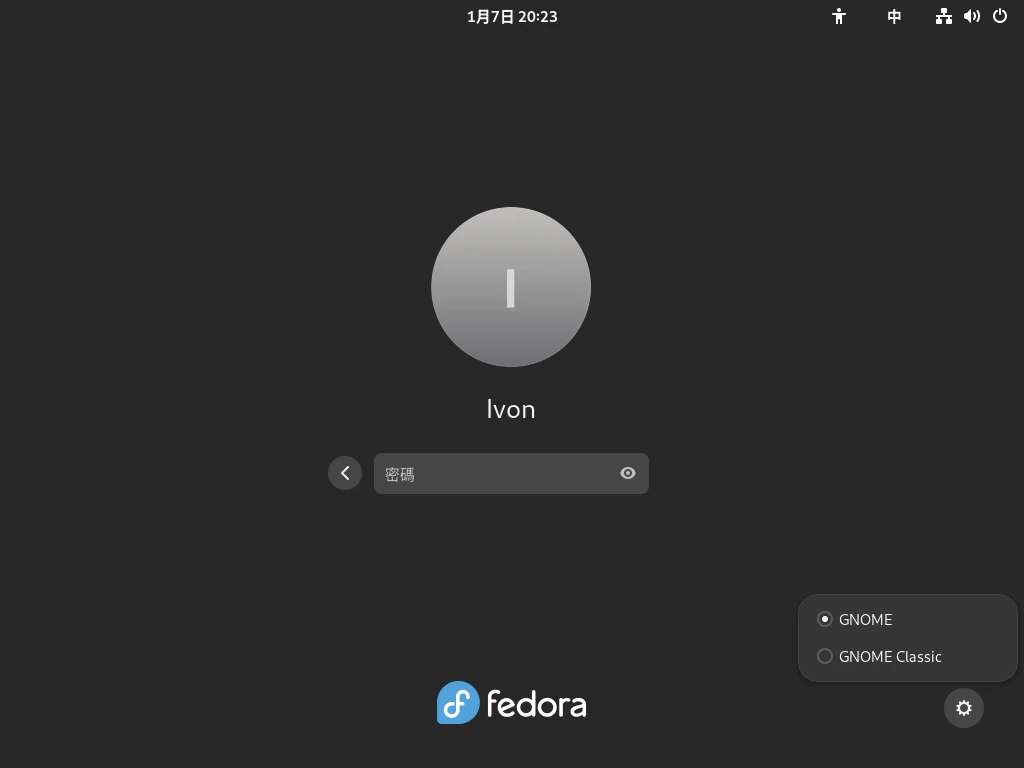 輸入密碼的時候,右下角能夠選取工作階段。GNOME最新版應該使用Wayland協定了,下面Xorg和GNOME Classic為舊式視窗系統,不推薦使用。