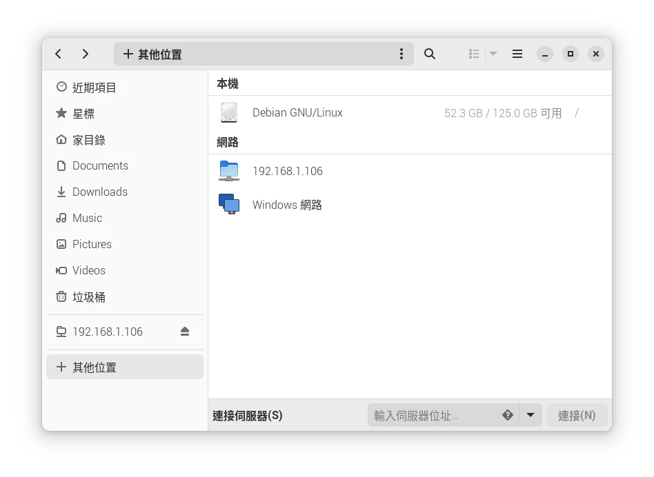 如果Android手機設定了共享資料夾功能,那麼GSConnect會幫你自動用STFP掛載,顯示在GNOME檔案管理器左側,這樣更方便你傳檔案。