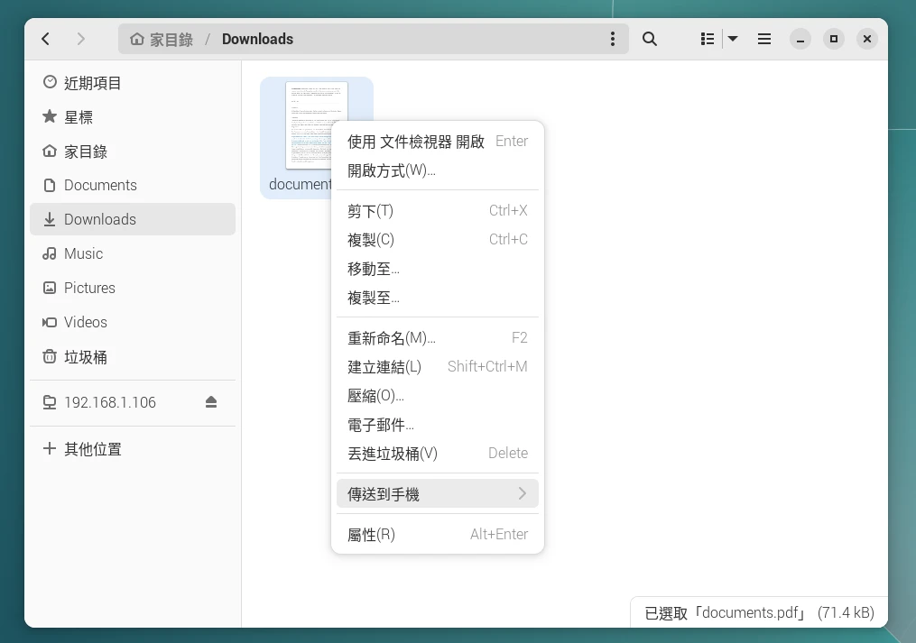 你可以在GNOME檔案管理員按右鍵,直接傳送電腦檔案到手機上。