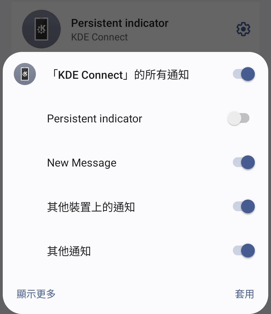 如果覺得KDE Connect手機的常駐通知很煩,就對其長按,將「一致化指示器」的通知關閉。