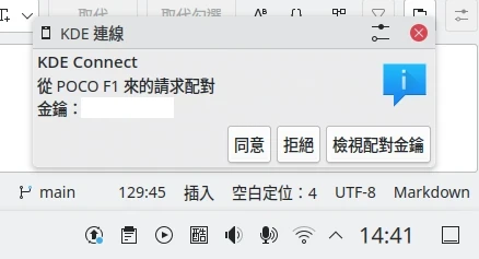 確認防火牆有允許KDE Connect通過後,在電腦1開啟KDE Connect,點選裝置列表中的電腦2,點選【請求配對】,在電腦2上同意配對。