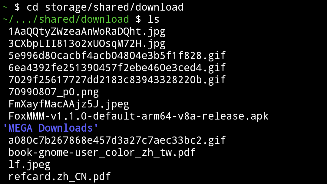 1. 在允許Termux存取手機儲存空間後,它會被掛載到Termux家目錄的storage/shared目錄。輸入ls指令確認下: