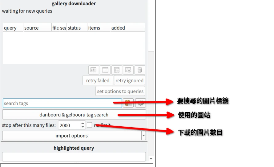 如下圖所示,搜尋框下面的圖站選取Danbooru,輸入圖片標籤開始搜尋圖片,並將下載的圖片數量上限改成20。