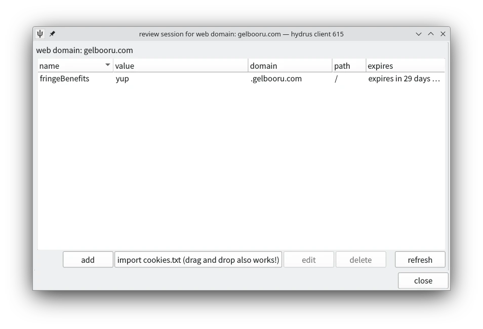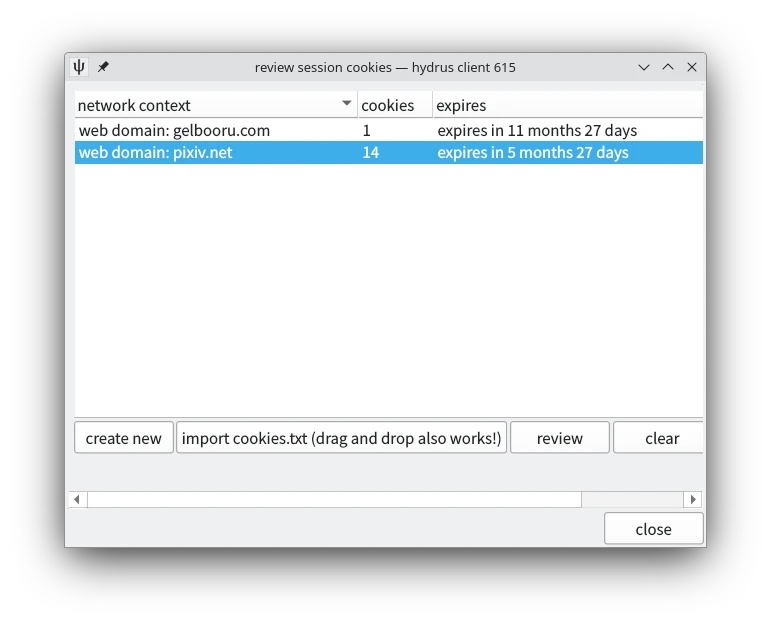 至於Pixiv沒有登入帳號的情況下,無法顯示R18圖片,又Hydrus無法處理登入請求,因此需要手動取得瀏覽器的cookie。其他不能從Hydrus登入的網站應該也能這樣如法炮製。