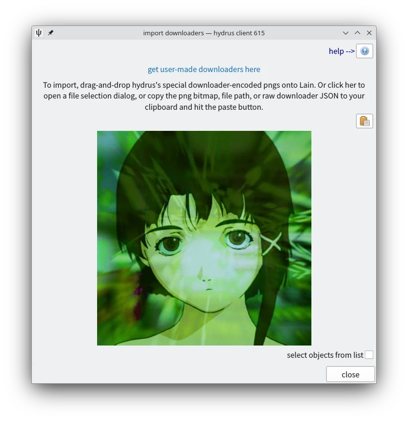 需要更多下載器的請到Github或Gitlab找,譬如Hydrus-Presets-and-Scripts。Hydrus開發者要求下載器得用.png格式分發,故點選network → downloaders → import downloaders,將.png檔案拖到Lain的頭上匯入下載器。