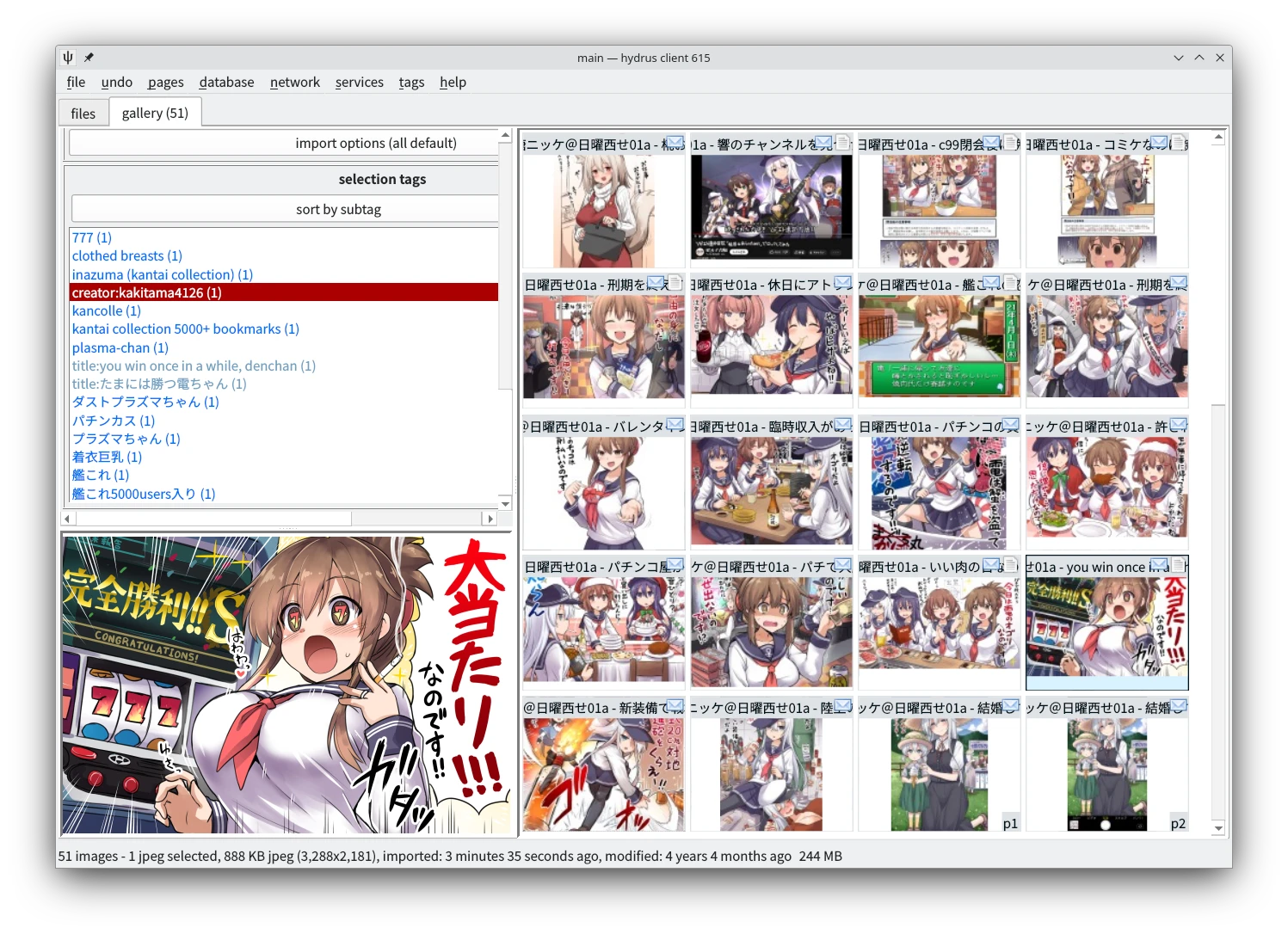 這個用來下載大量圖片非常好用,不只能夠快速取得符合搜尋條件的圖片,還能夠把圖站上面的標籤一併複製下來,省得日後手動打標籤的痛苦。Hydrus Network作者在官方文件裡面警告使用者不要過度濫用,一抓可能就會停不下來,一不小心就會精盡人亡。