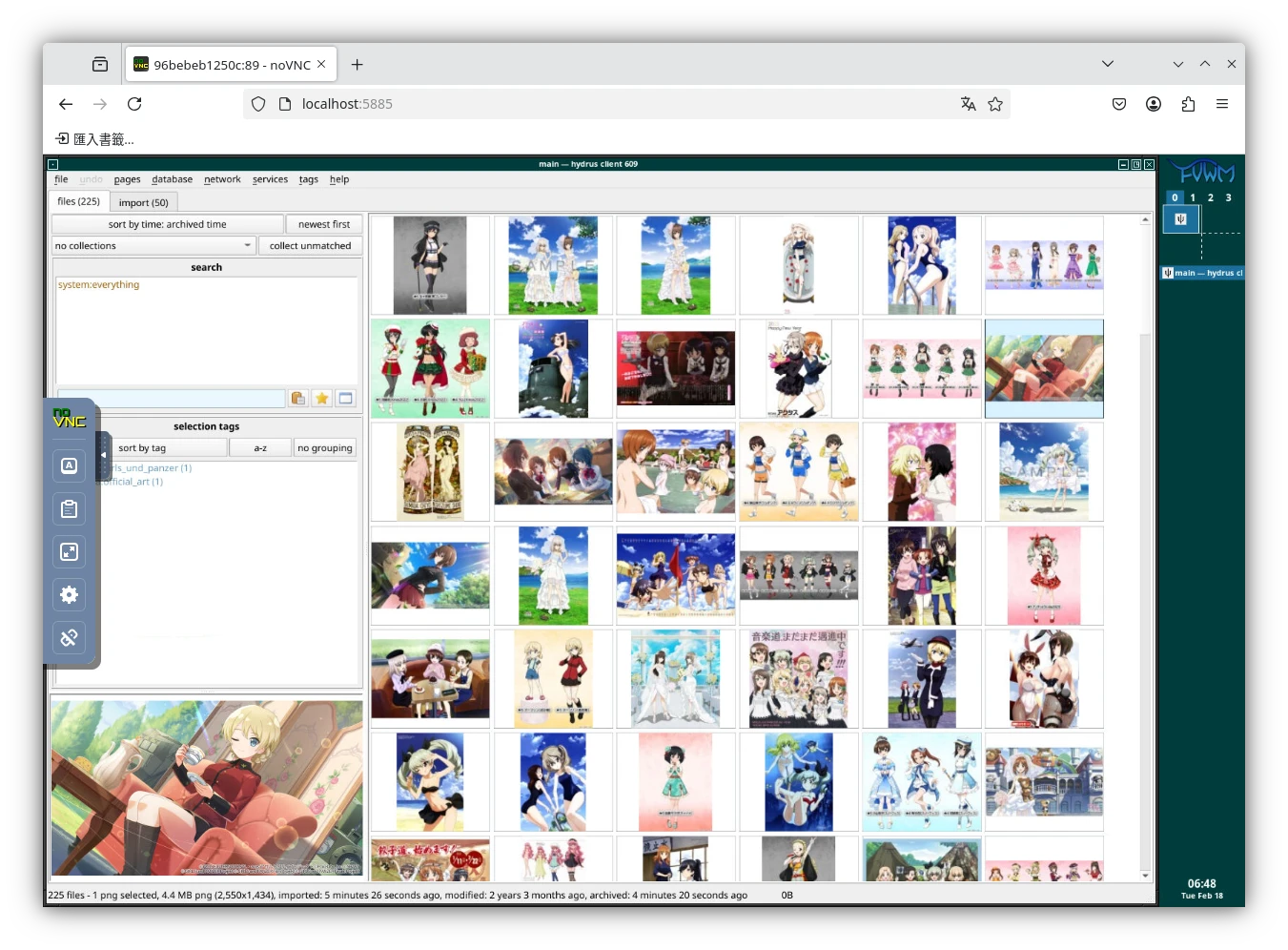 如果要純遠端存取Hydrus Network界面,不使用桌面版本的話,那麼Hydrus Network就只適合放圖片與影片了,因為Docker映像檔裡面沒有PDF檢視器,看電子書會有困難,影片播放因為VNC緣故也很差勁。