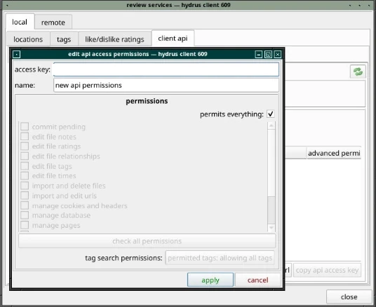 但有個問題要解決,Hydrus Network本體無法以headless模式執行,不能單純開著server端。這代表要用client api遠端存取,電腦必須啟動圖形界面,並開啟Hydrus Network主程式,之後client api服務才會跑起來。