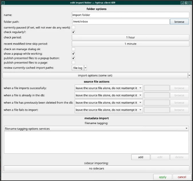 docker-compose.yml範例裡面,已經有一個收件匣的目錄。開啟Hydrus Network,勾選file → import and export folders → manage import folders,設定監視inbox目錄。這樣只要偵測到圖片,就會自動進行匯入作業。