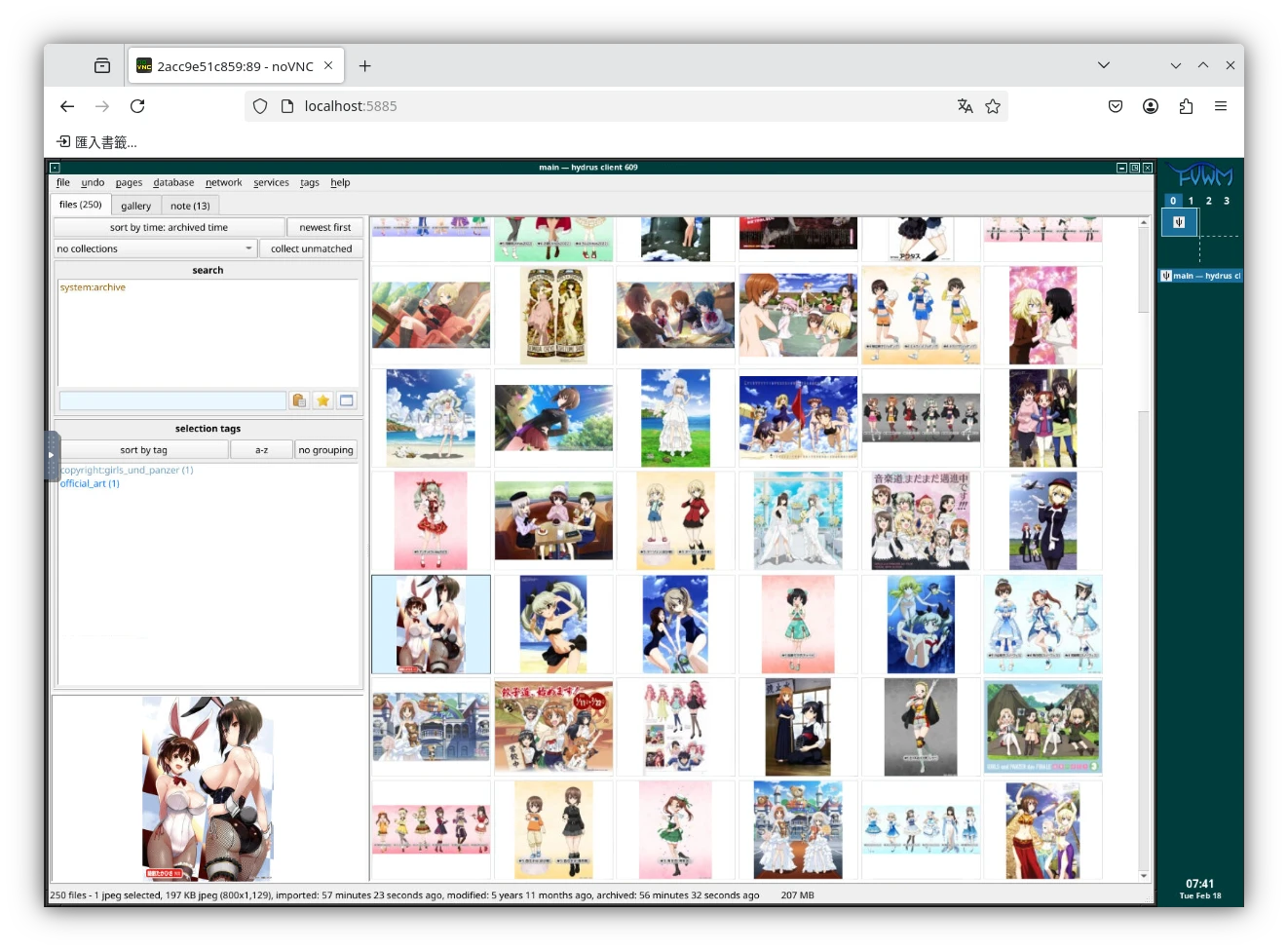 萬一主機沒有螢幕呢?如何在伺服器headless執行Hydrus Network?開發者給出的解法:使用Docker跑Alpine Linux系統,在裡面啟動FVWM視窗管理器與Hydrus Network,使其24小時待在線上,這樣就可以透過網頁noVNC,遠端存取Hydrus Network主程式。電腦不用啟動X視窗系統也可以headless的跑client api服務。