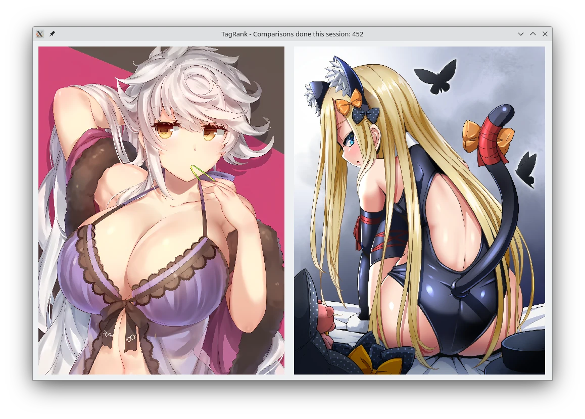 我們可以利用matjojo開發的「TagRank」程式,從Hydrus Network資料庫當中,選出一批圖片進行配對遊戲,藉此找出你最喜歡的標籤。有何用?統計性癖非常有用!這個程式適合經年累月的Hydrus Network使用者使用,就是老手啦。因為你不知道過去究竟從網路上下載了什麼鬼東西,這個程式或許能產生意想不到的結果。可能你蒐集了很多特定角色的圖片,以為自己對老公/老婆很忠誠,結果統計出來的結果卻不是這麼一回事呢!
