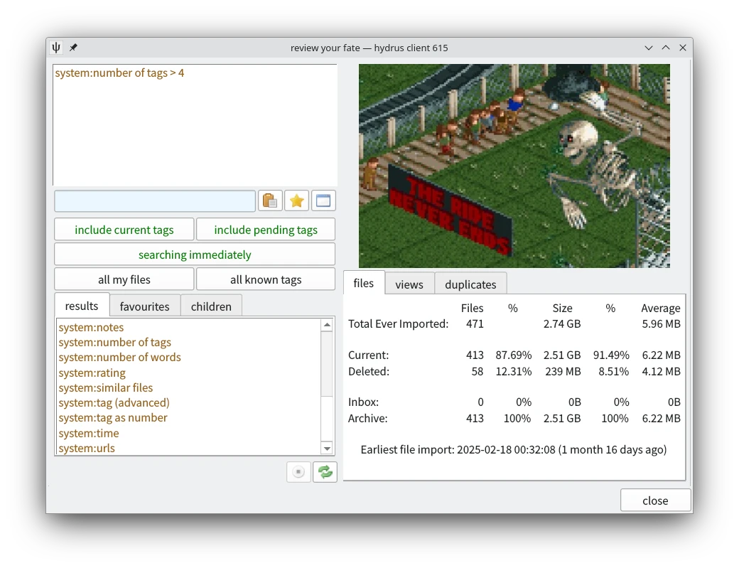 在玩這個遊戲之前,請確保Hydrus Network資料庫的檔案有完整打上標籤再使用這個程式。因為它會run過整個資料庫,統計出結果。相當依賴你的檔案所打的標籤。