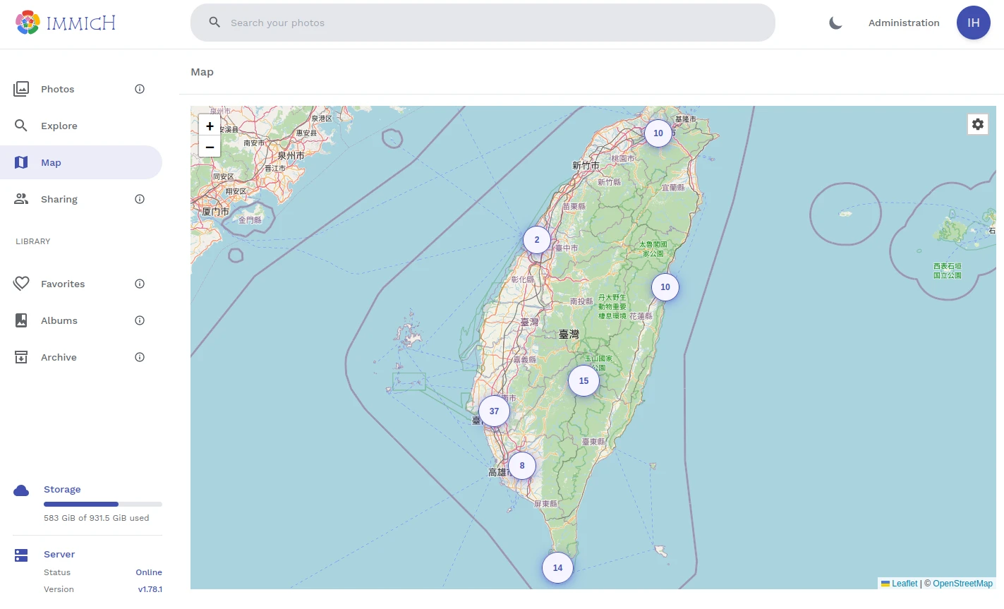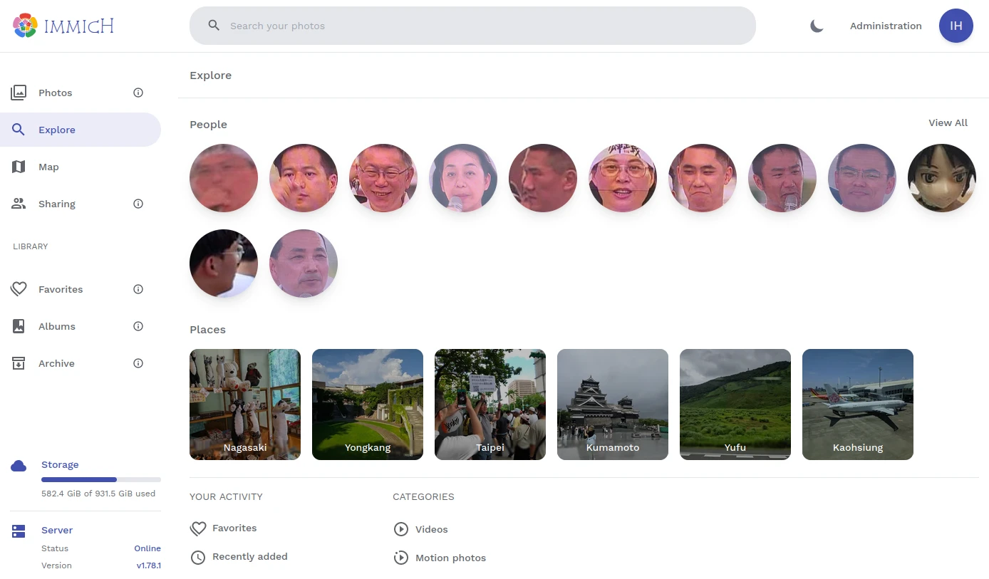Ivon用下來,覺得Immich功能做得很像Google相簿,繼承Google相簿簡單的特色,該有的功能都有:讀取Exif、公開共享相簿、回憶集錦(歷史上的今天)、臉部辨識、定時備份、支援中文界面等等。