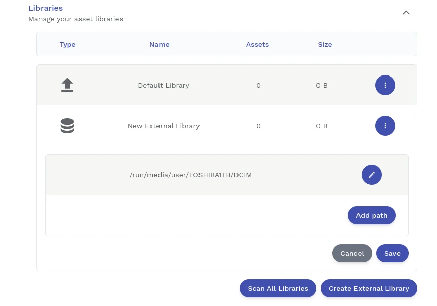 此功能稱作外部圖庫 (Library) ,Immich預設的圖庫是UPLOAD,不能刪除。針對喜歡手動用資料夾分類照片的使用者,你可以新增多個外部圖庫,直接掃描現有的硬碟資料夾,讓Immich讀取並彩現在網頁,不會對照片做任何變更,這樣就不用重新上傳照片了。