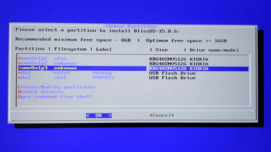 - 選擇將Bliss OS安裝到空閒的128GB分區