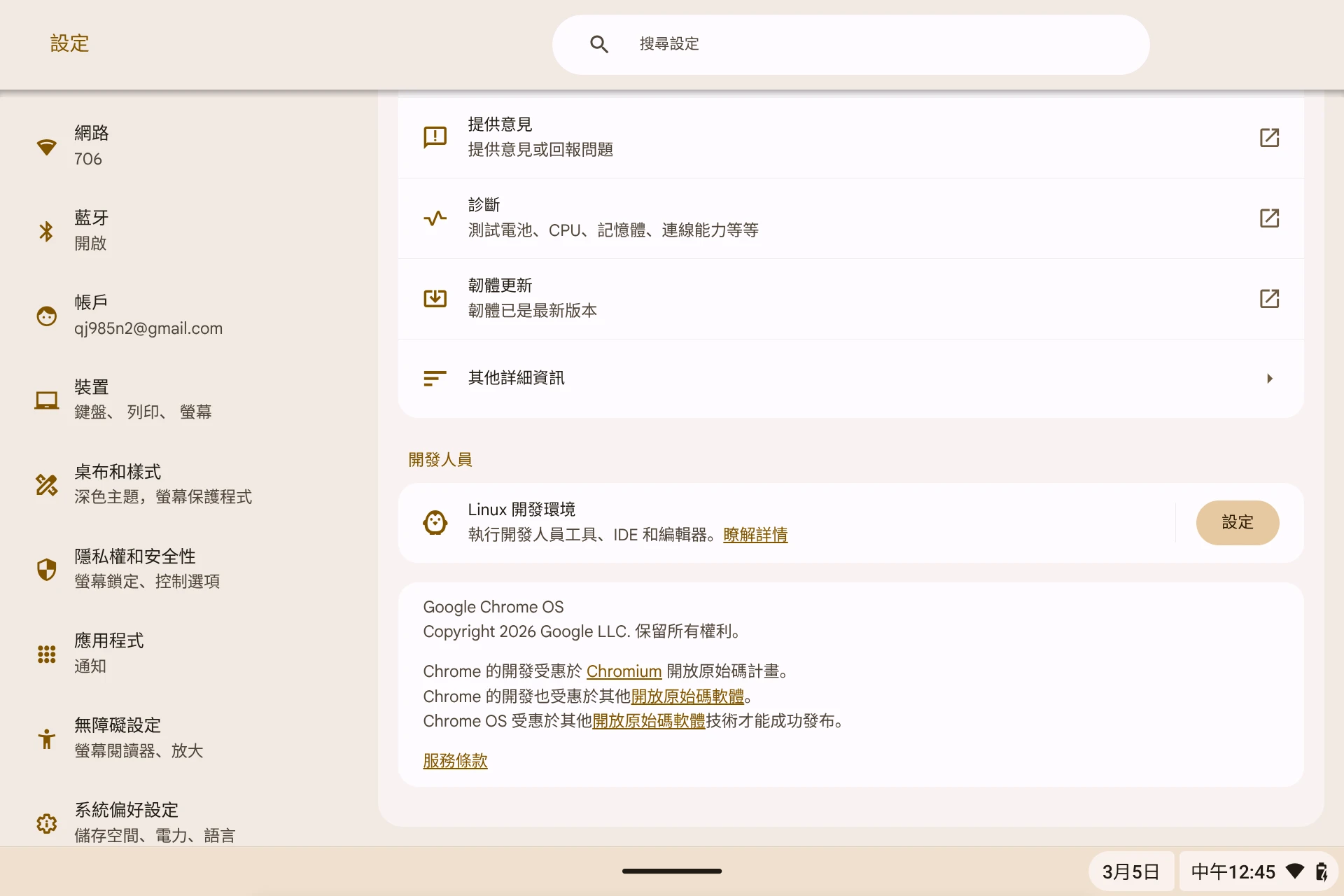 目前ChromeOS Flex版本145,使用Linux 6.6核心,Surface Go 2硬體功能幾乎正常!
