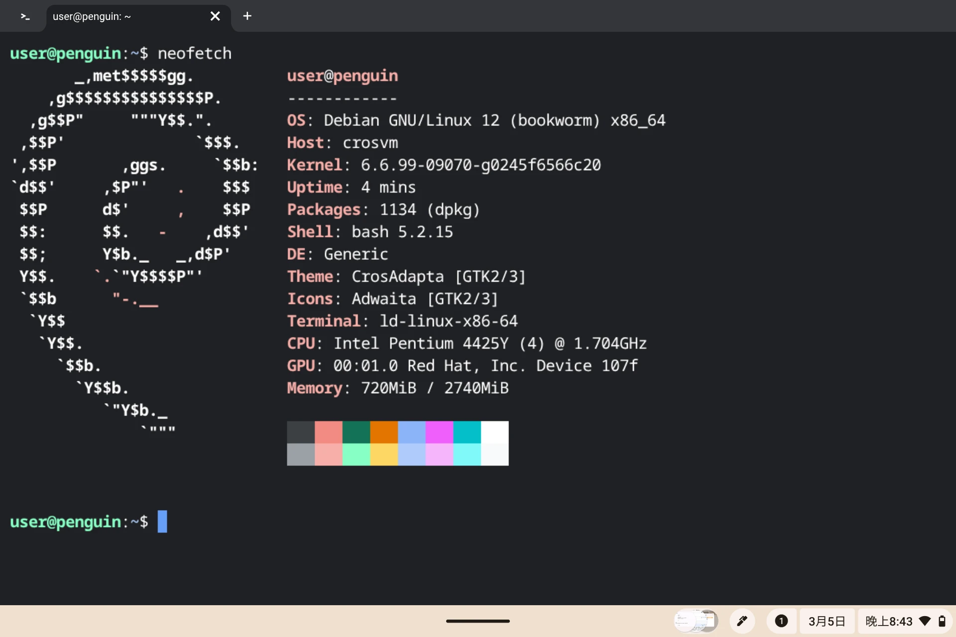 這樣會得到一個Debian虛擬機。裡面就可以安裝一般GNU/Linux的程式了。透過「終端機」程式登入Linux Bash shell。