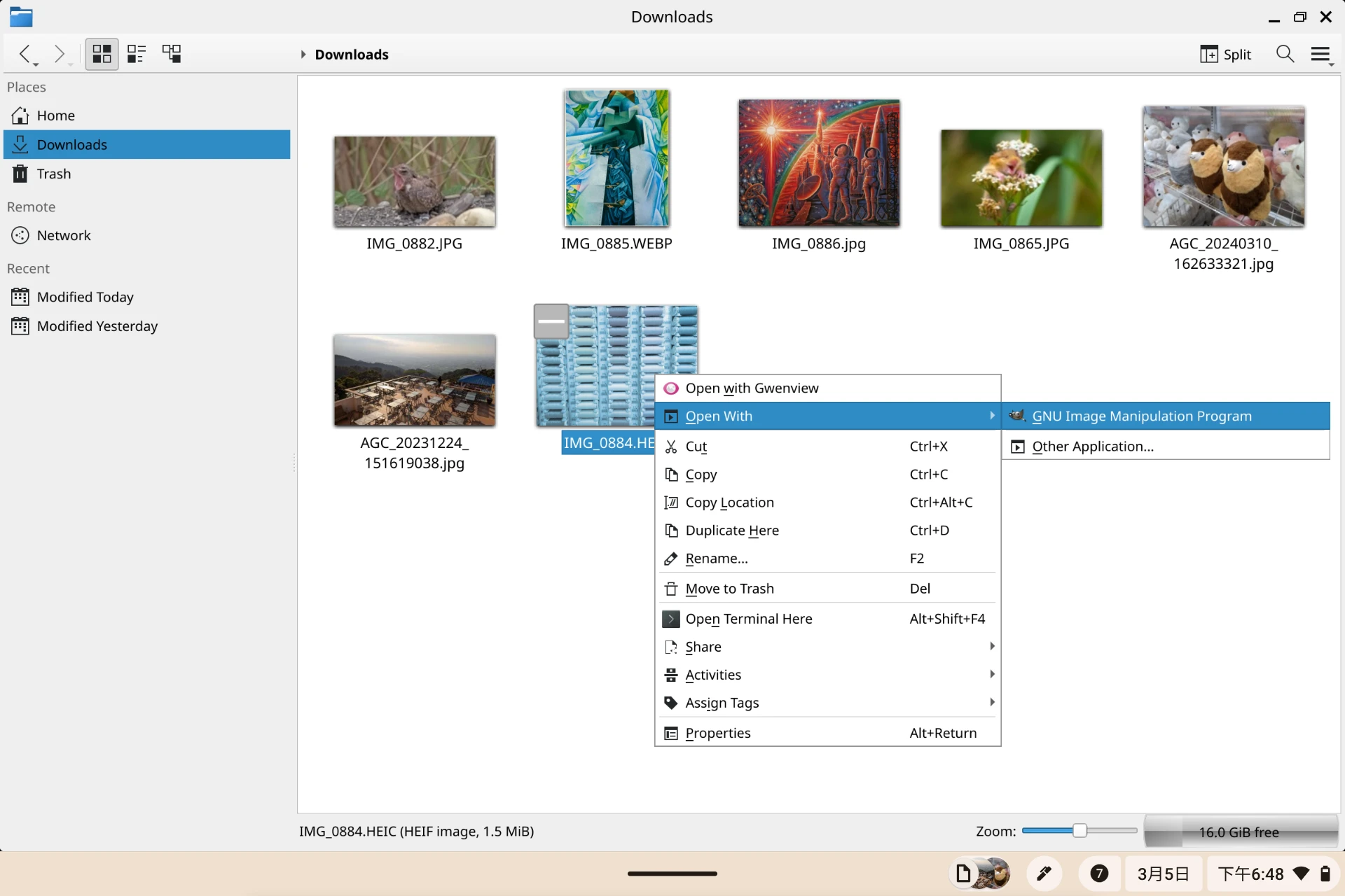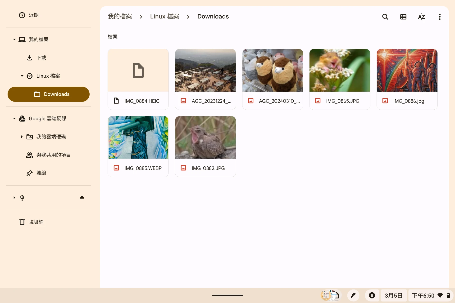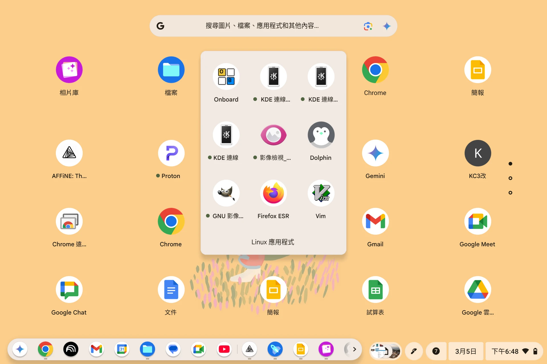 dolphin檔案管理器,這樣就能方便調用Linux的程式編輯檔案,而不會被ChromeOS受限。例如,我可以在Dolphin使用GIMP開啟圖片編輯。(不過如果你在ChromeOS的檔案瀏覽器點選檔案,它也會提示你用Linux的程式去開)
