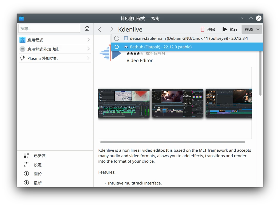 - 安裝Flatpak,以及與KDE Discover應用程式商店整合的套件