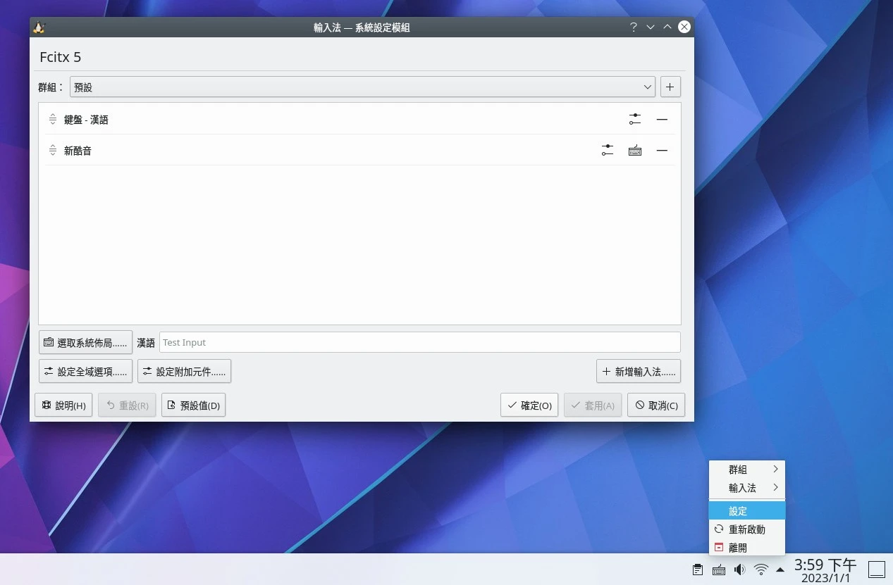 Debian預設安裝的是Fcitx5+新酷音輸入法。KDE可在系統右下角找到輸入法設定。按CTRL+空白鍵切換新酷音輸入法。