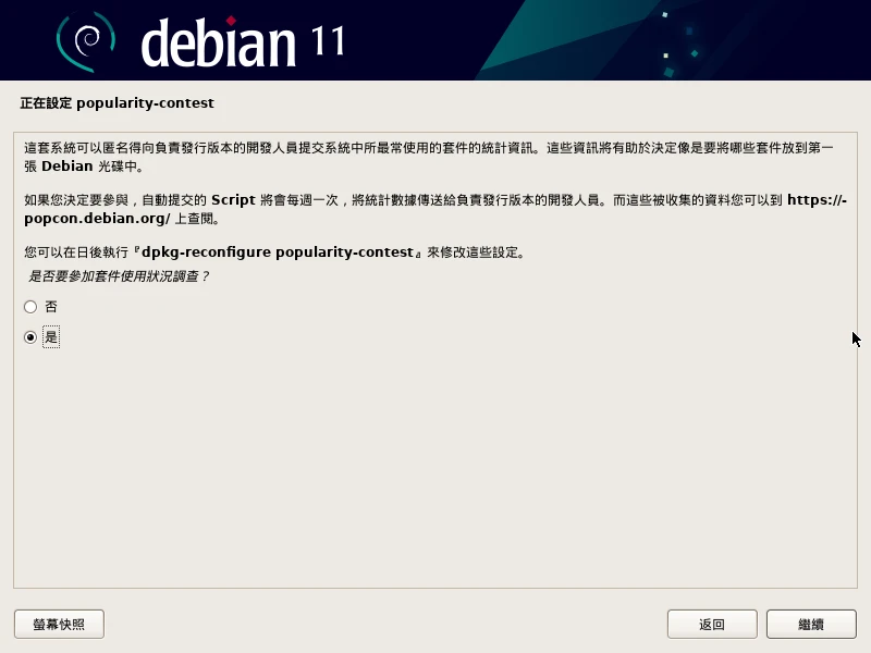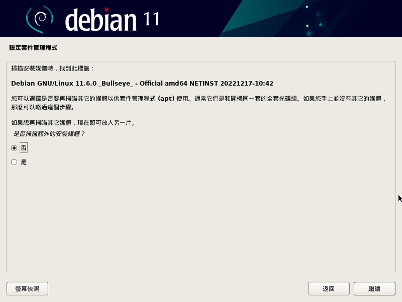 Debian會自動連上網路。接著Debian可能會偵測需要非自由韌體才能啟動的硬體,這個我們後面再處理,這裡選否。