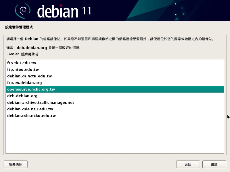 套件管理員(APT)的區域選台灣,伺服器Ivon個人是比較愛用國網中心(NCHC)的鏡像站。下一步的Proxy留空。