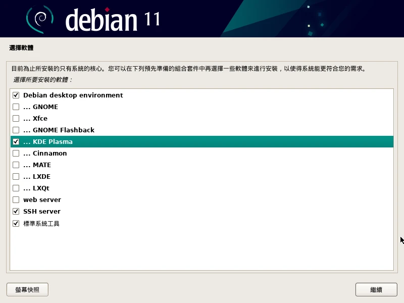 最後一個步驟,安裝桌面環境。這裡我勾選KDE Plasma,內含常用文書軟體和工具程式。再勾選安裝SSH服務。