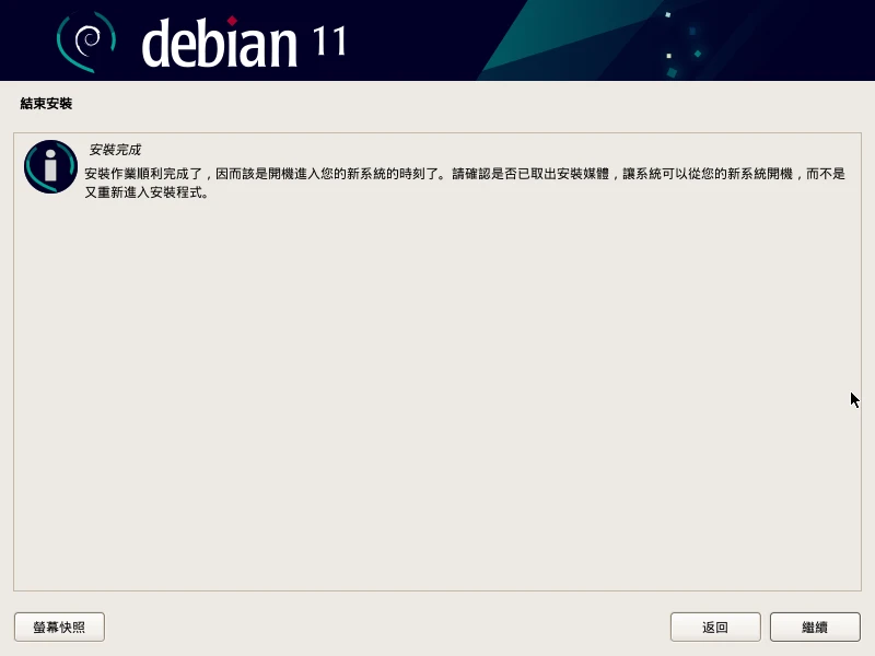 看到安裝完成的畫面就可以直接拔掉隨身碟了,接著按下是,電腦會重新開機,進入新安裝的Debian系統。