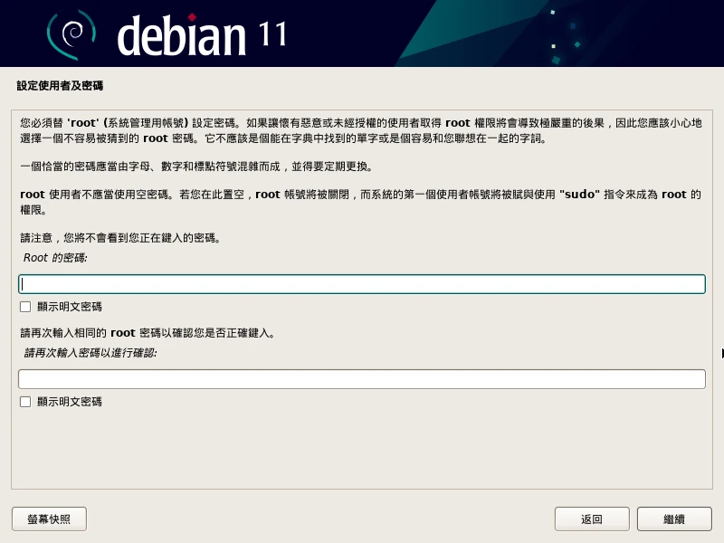設定Root帳號的密碼 (注意:Root密碼可留空。如果你設定了Root帳號的密碼,後面要手動將一般使用者加入sudoers)