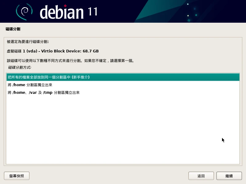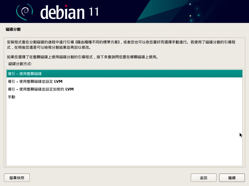 分割硬碟的階段,選取使用整個磁碟,刪除所有硬碟上的資料並安裝Debian,之後一直下一步。