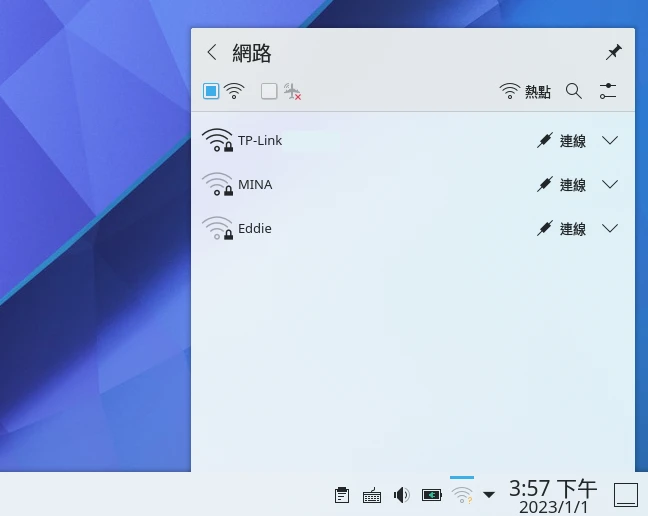 - 安裝完後重開機,KDE應該就能用系統右下角的圖形界面控制Wifi和藍芽連線了。