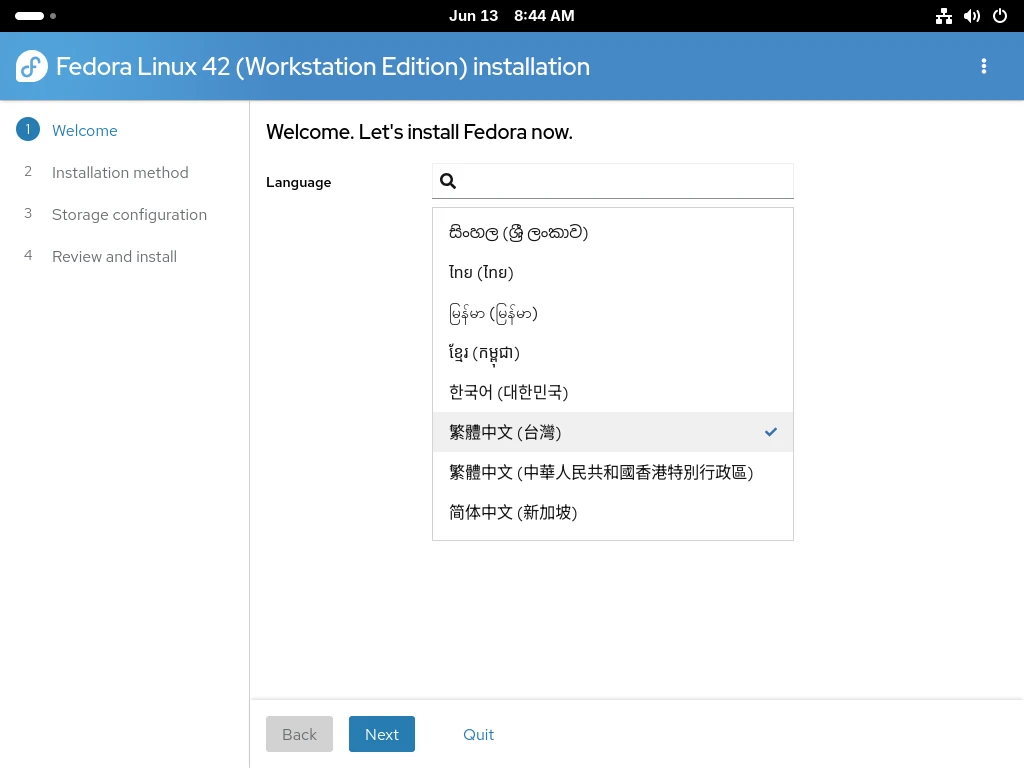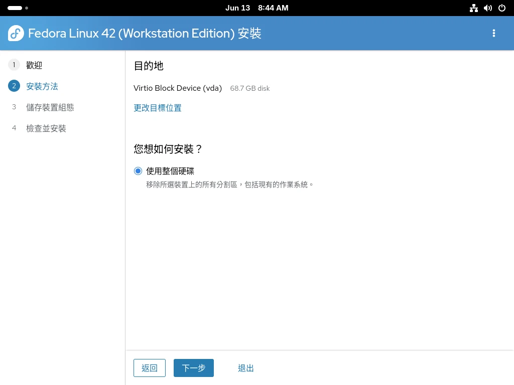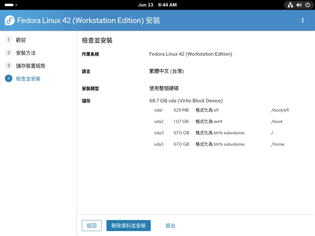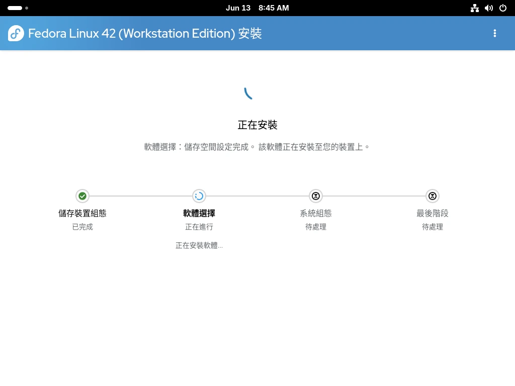 開機進入Fedora安裝畫面。Fedora 42的新安裝器改善了以往選項說明文字模糊不清的問題,基本上只要一直下一步就行了。使用者帳號是開機後才要新增。