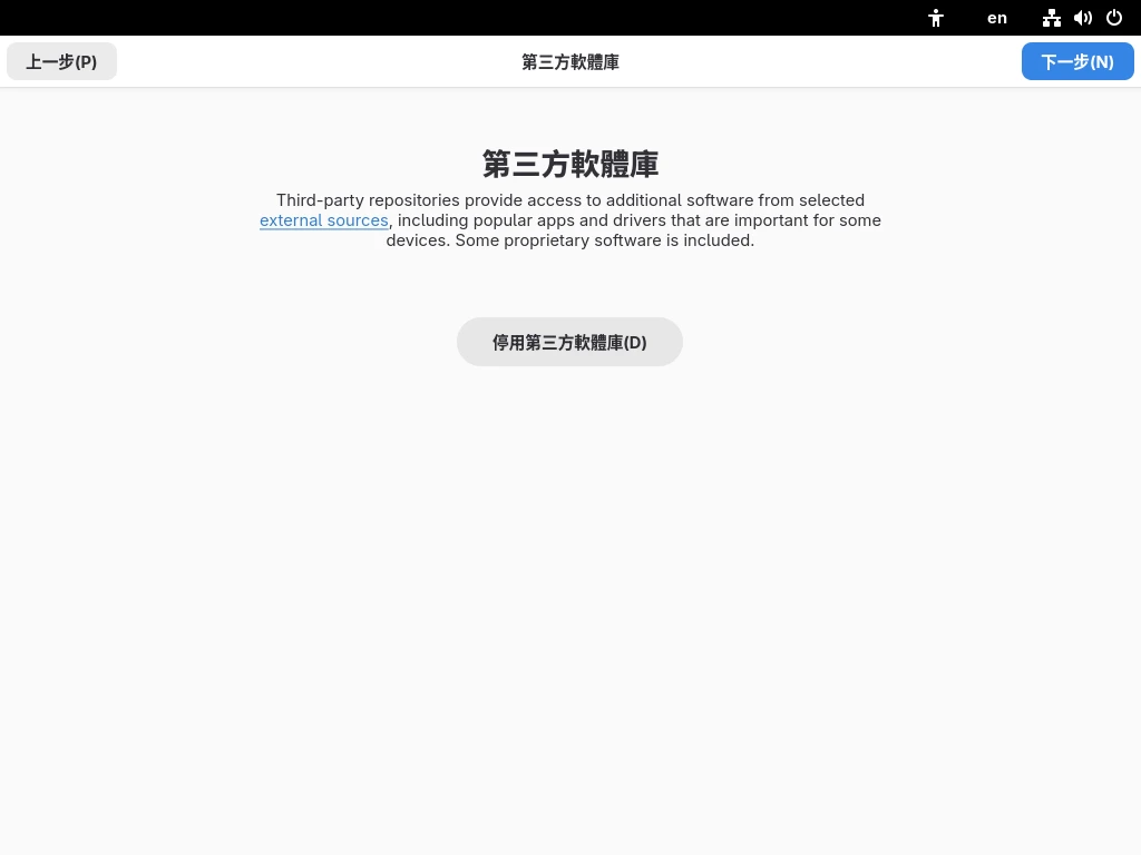 開機後記得開啟第三方軟體庫,方便安裝閉源驅動