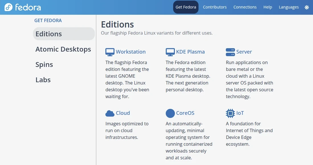 Fedora Workstation預設桌面環境為GNOME與KDE Plasma,另外尚提供許多「Spin」版,讓使用者能夠安裝XFCE、Cinnamon、Sway等桌面。