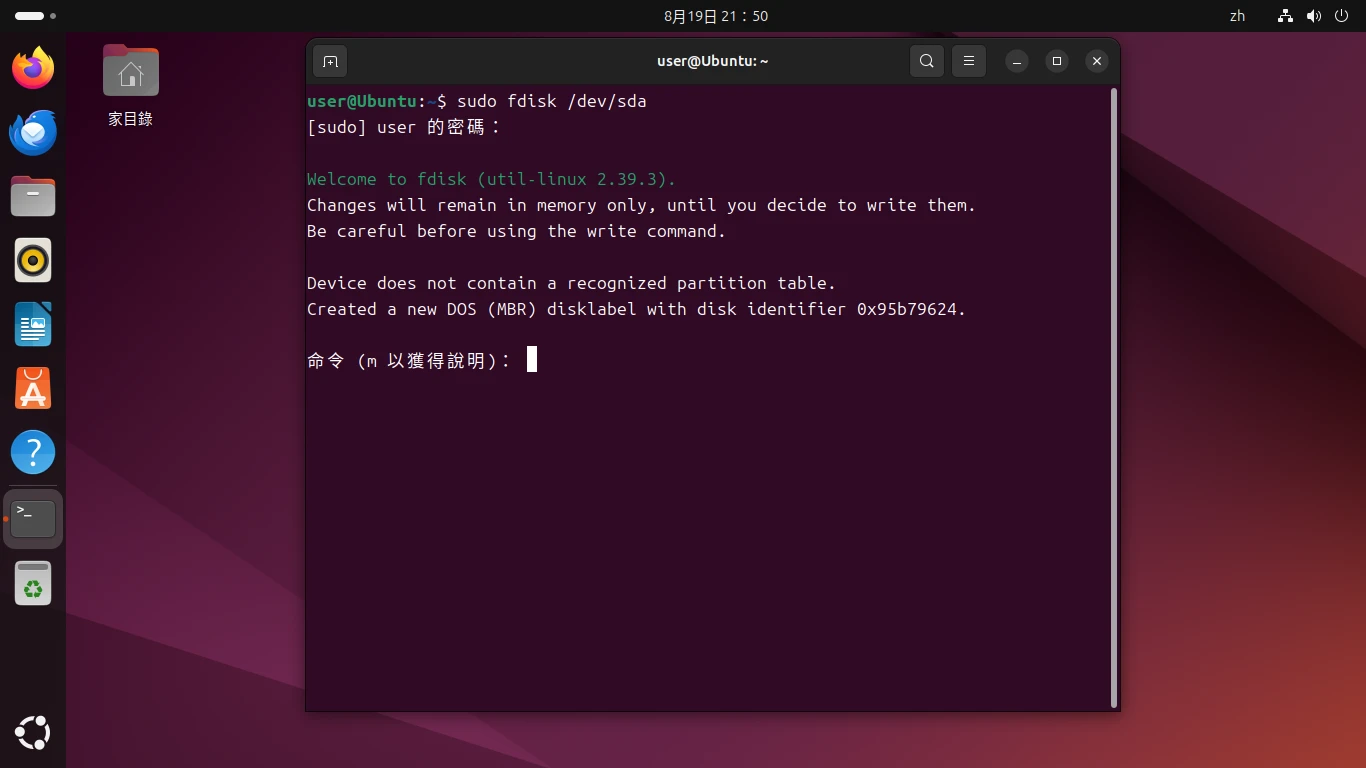 lsblk指令確定虛擬磁碟裝置代號,我這裡是/dev/sda,因此用這個指令選取: