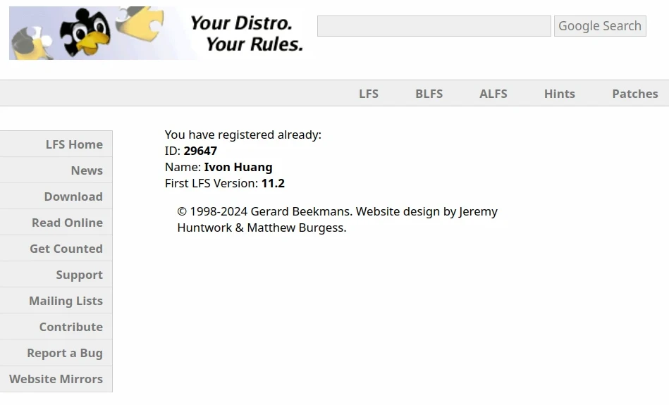 安裝完成後記得在LFS官網登記名字,並寫上第一次安裝的版號!
