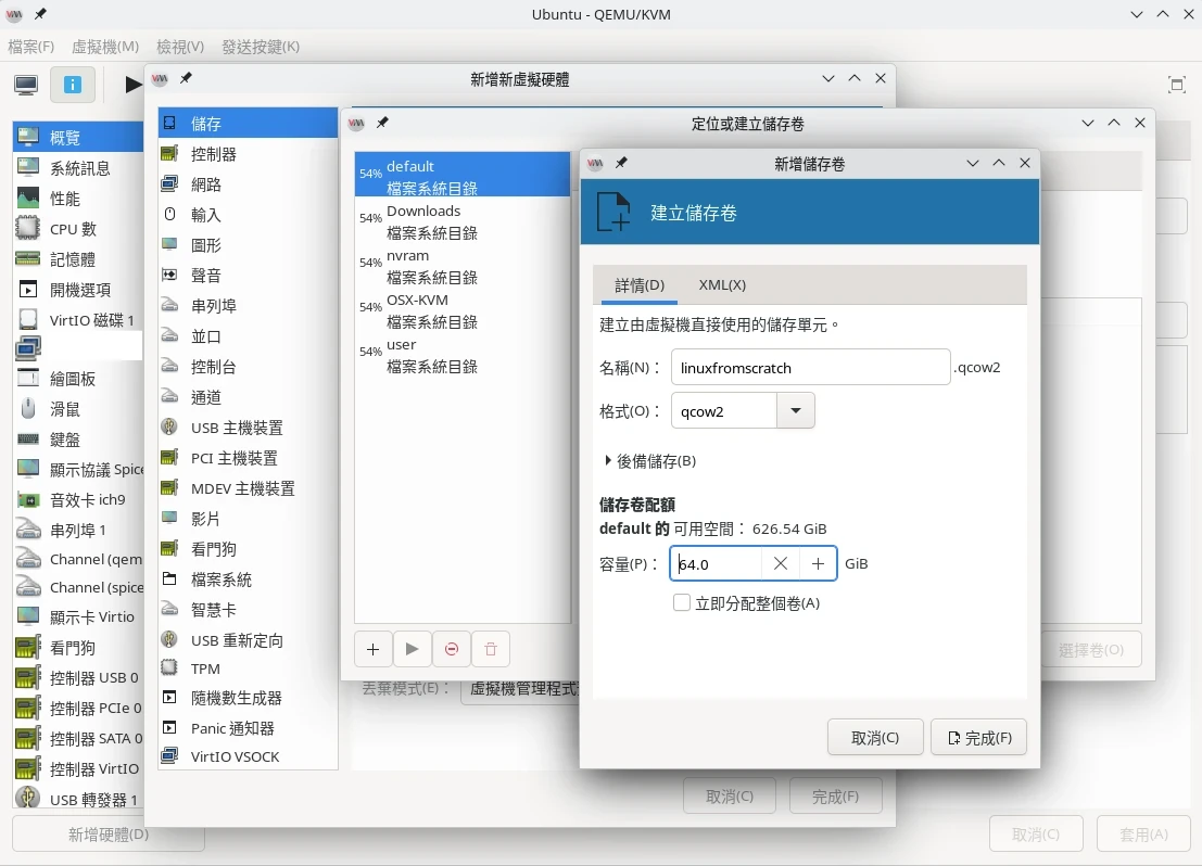 安裝完成後關機。新增一個空的虛擬硬碟,至少64GB。例如Virt Manager就是點選虛擬機 → 新增硬體 → 新增儲存空間,新增一個叫做