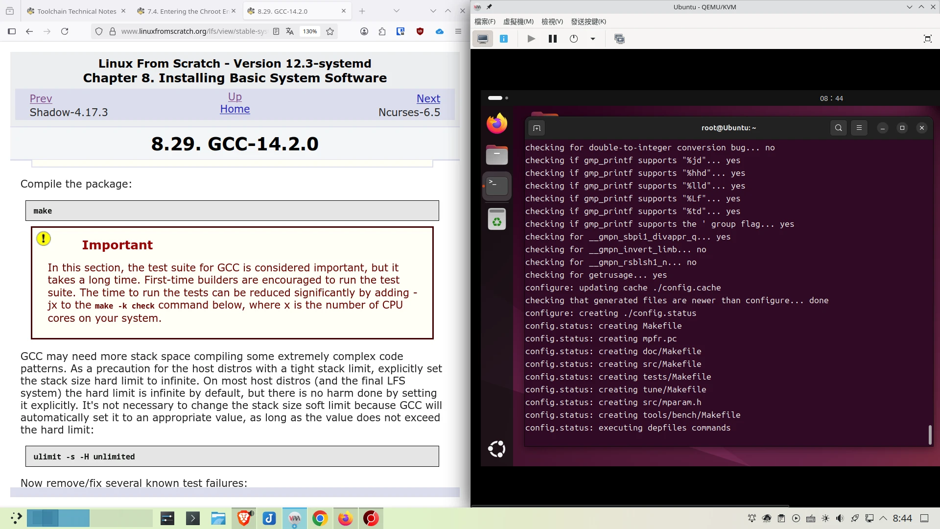 照著步驟走就行,到最後一章登出LFS的chroot系統,將Ubuntu虛擬機關機。然後把裝有LFS的虛擬磁碟掛接到另外一個虛擬機,應該能夠順利開機。