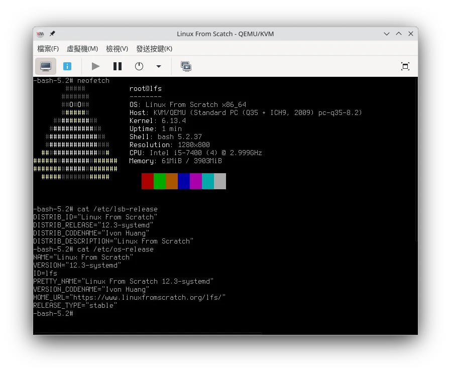 當然了,LFS一開始很難自力更生,要往後讀BLFS的內容。你可能還是需要用Ubuntu虛擬機開機,然後用chroot進入LFS安裝額外套件。這個時候就把LFS的虛擬磁碟重新掛接在Ubuntu虛擬機就行了。