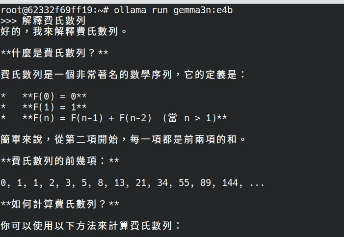 ollama run gemma3n:e4b等待載入完成,開始跟語言模型對話吧。